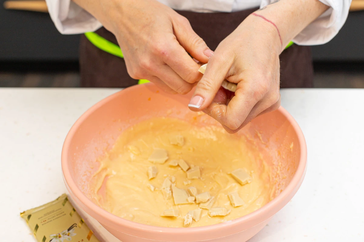Поломайте белый шоколад кусочками прямо в тесто и ещё раз перемешайте.