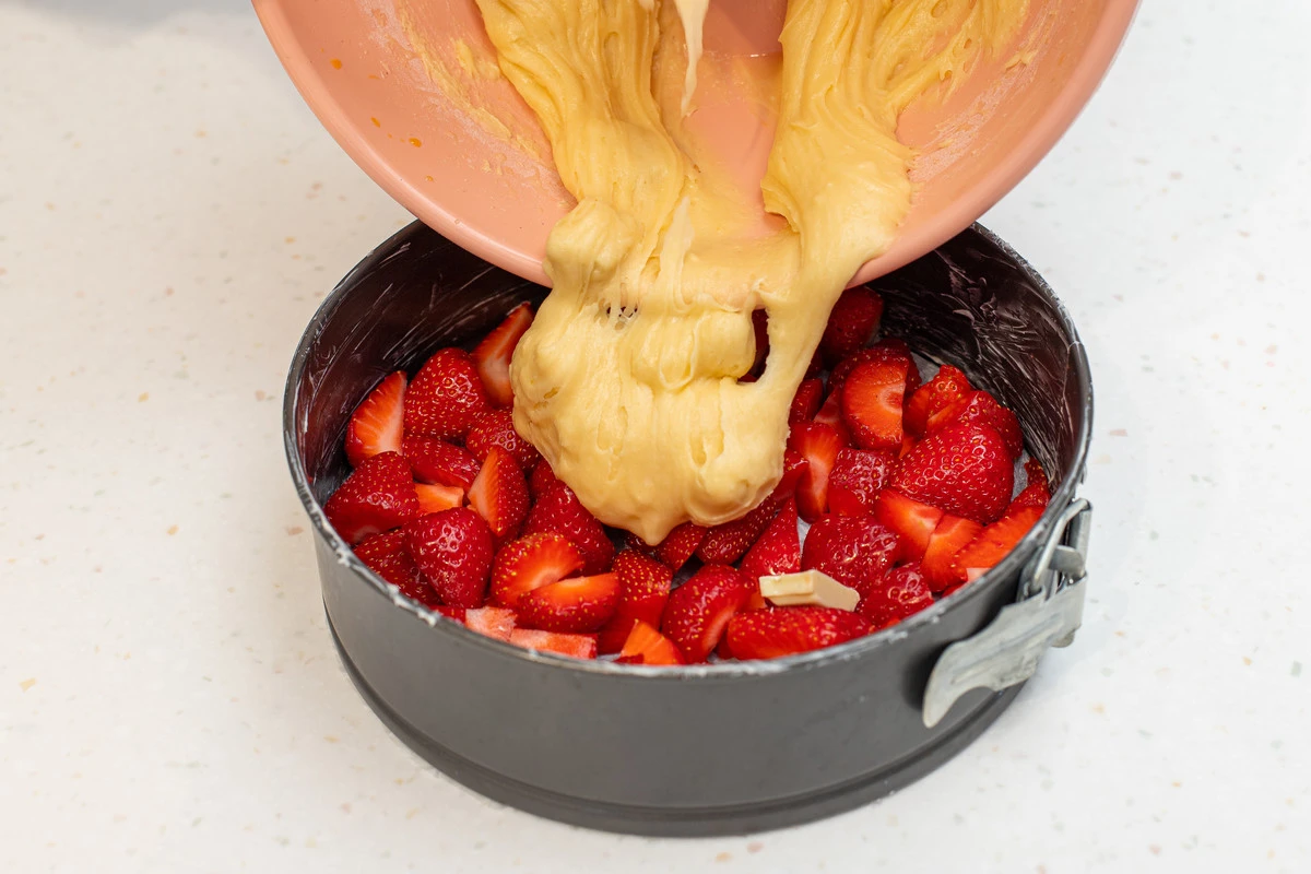 Клубнику выложите на дно формы, залейте тестом. Поставьте в разогретую до 180 °C духовку и выпекайте около 40-45 минут до готовности.