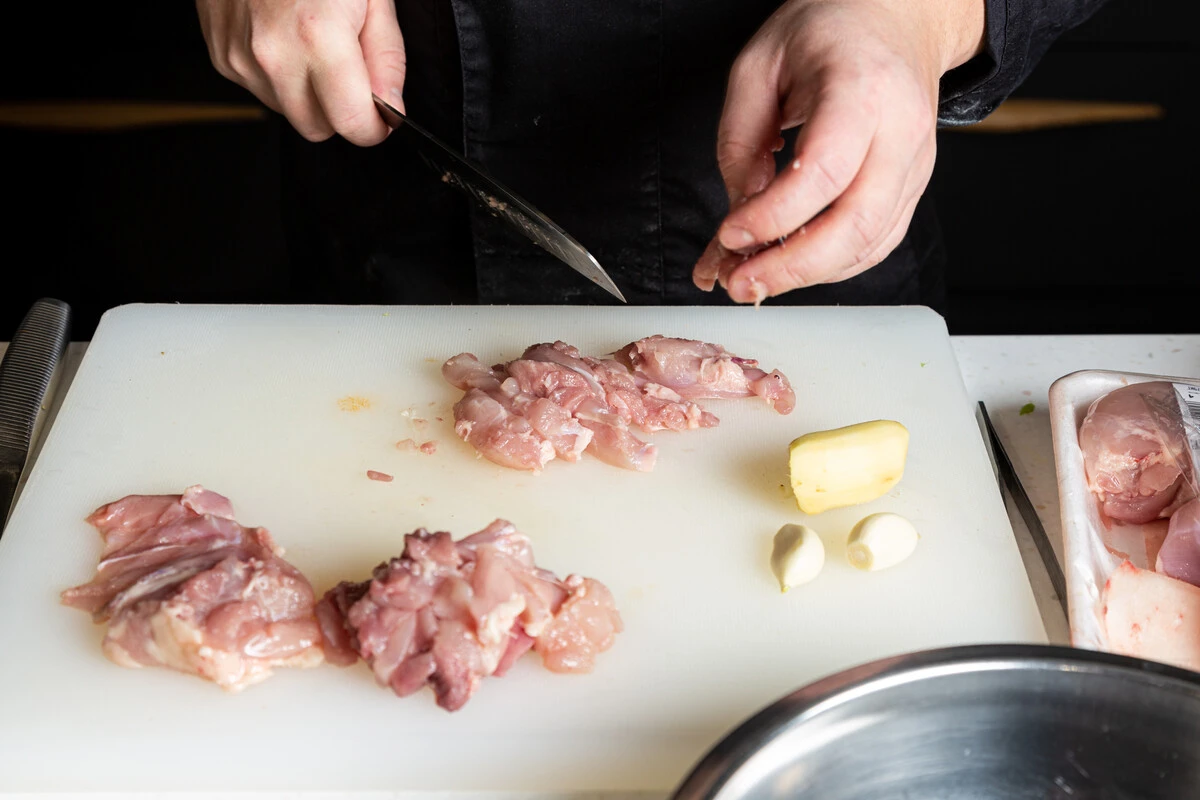 Филе курицы нарежьте кубиками, имбирь — тонкой соломкой, а чеснок мелко порубите.