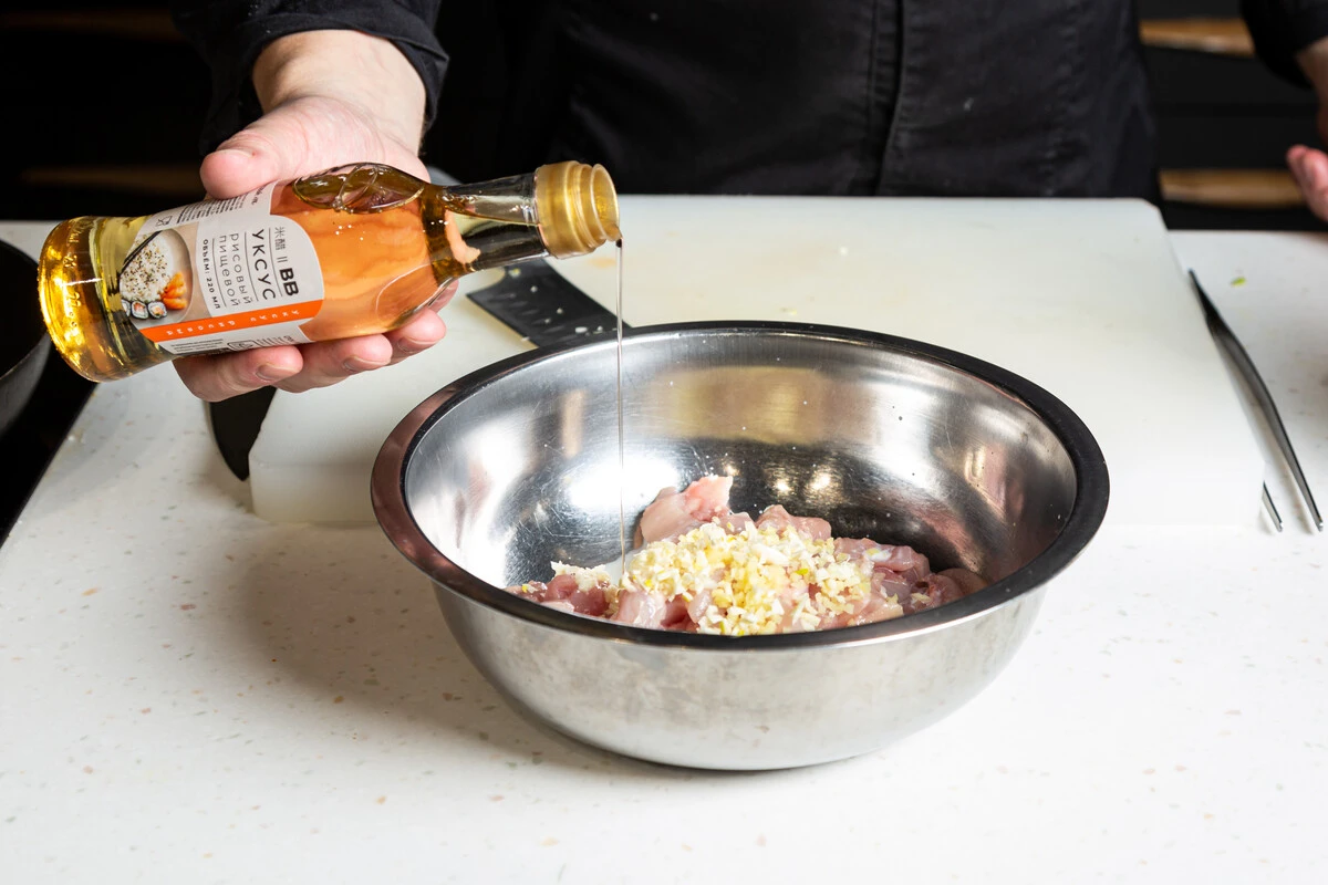 Смешайте кусочки курицы с молоком, рубленым чесноком и имбирём, добавьте рисовый уксус и соль. Оставьте мариноваться на 20–30 минут.