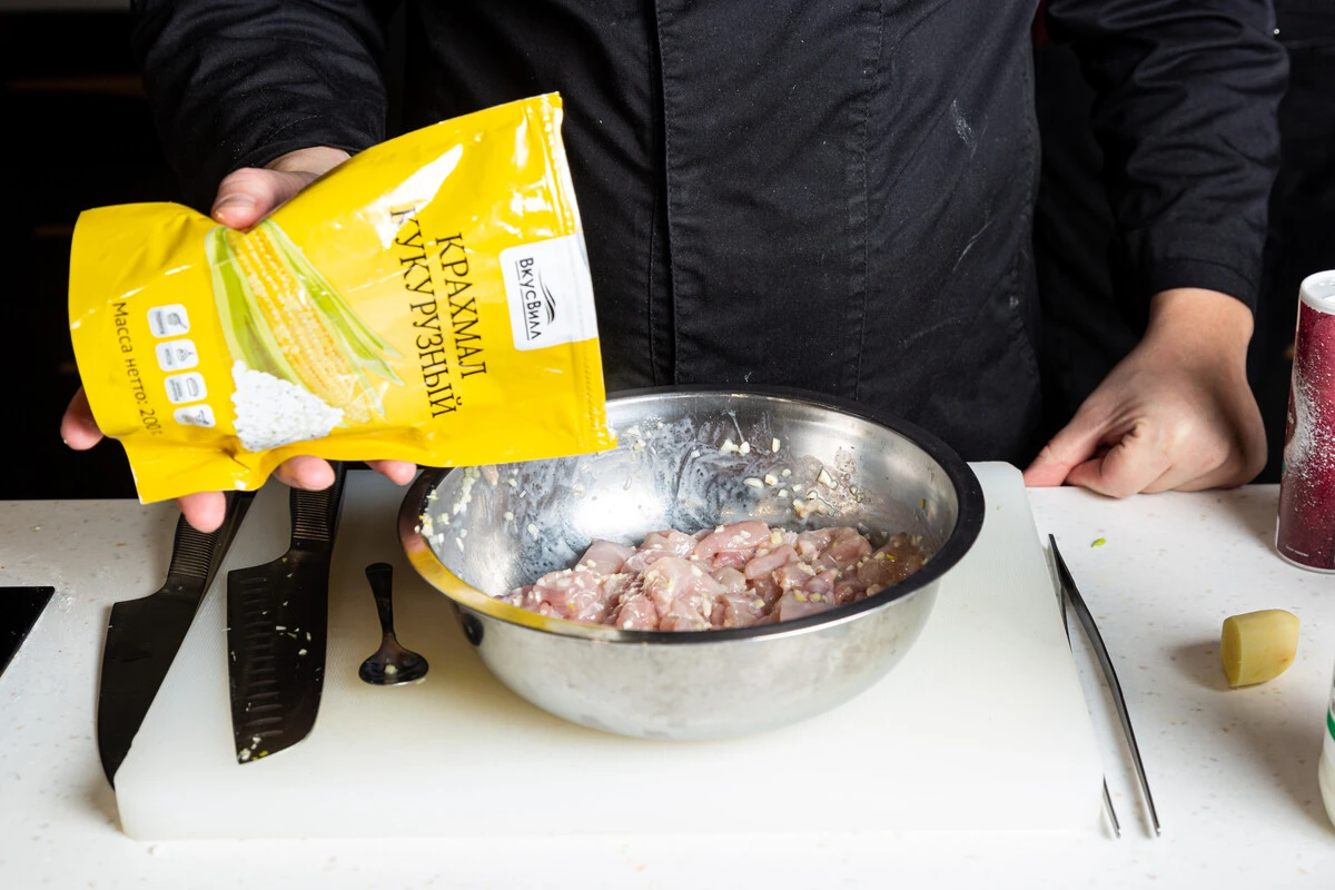 Обваляйте кусочки курицы в кукурузном крахмале.