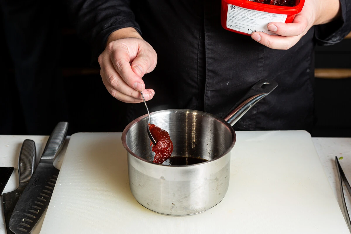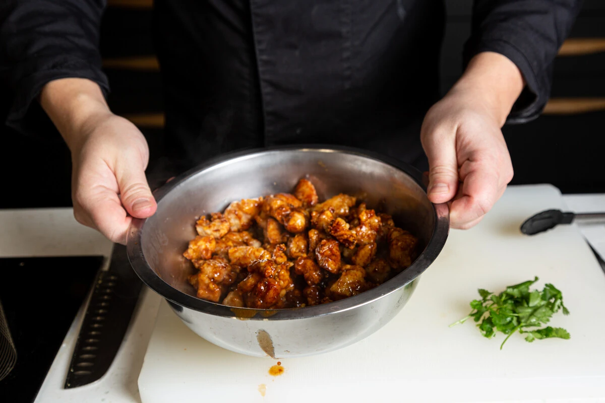 Для соуса смешайте соевый соус, яблочный уксус, кочудян, мёд, кунжутное масло, сахар, добавьте чеснок и имбирь, крахмал, а также немного перца. Варите, пока соус не загустеет, постоянно помешивая.