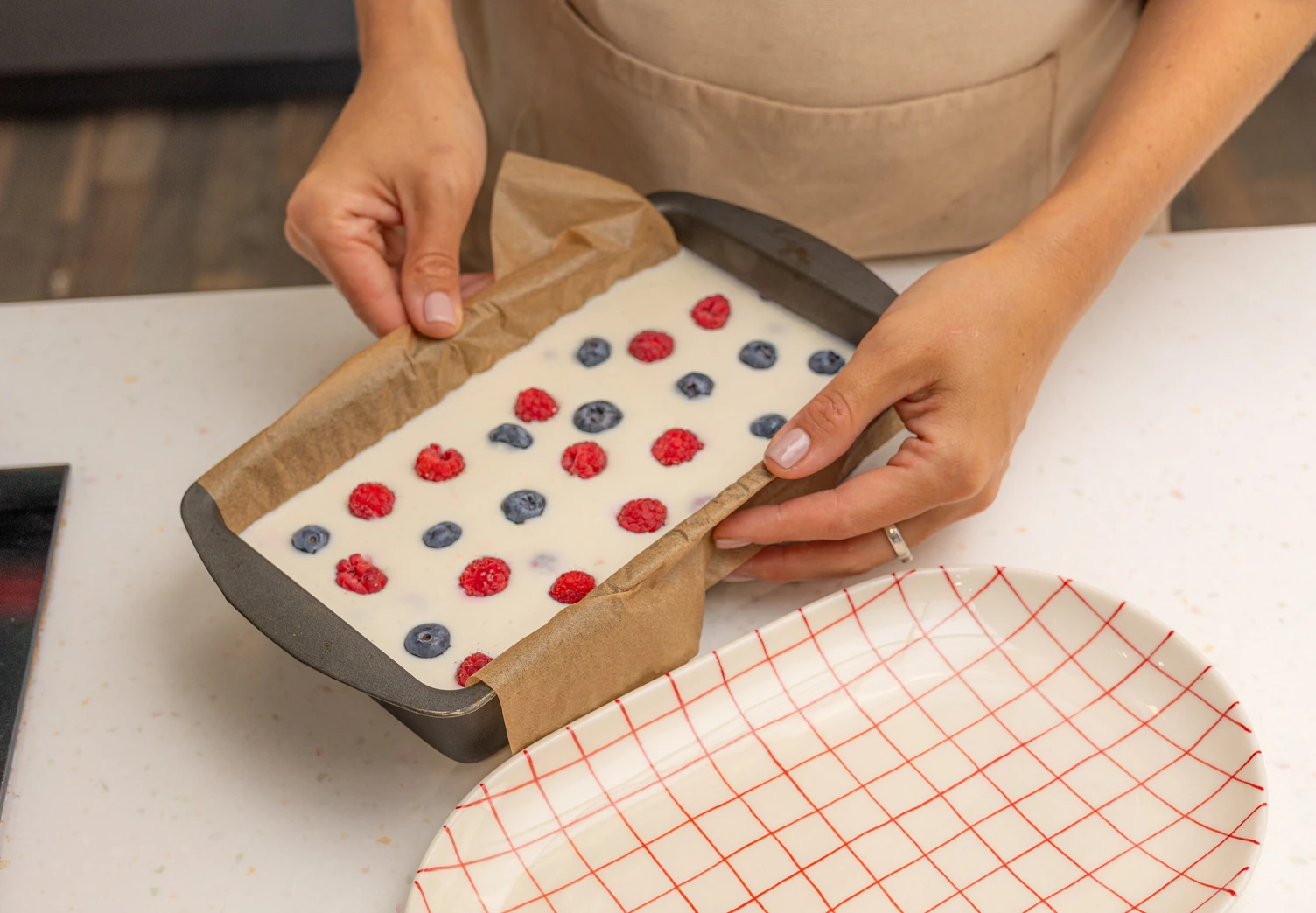 Форму для кекса или любую другую выстелите пергаментом, выложите половину сметанной смеси, на неё — ⅔ фруктов и ягод. Если используете силиконовую форму, пергамент не понадобится.