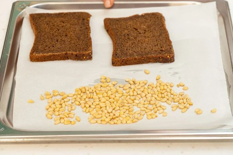 Застелите противень бумагой для выпечки. Выложите ломтики хлеба и насыпьте орешки. Запекайте в разогретой до 180 ℃ духовке в течение 10 минут.