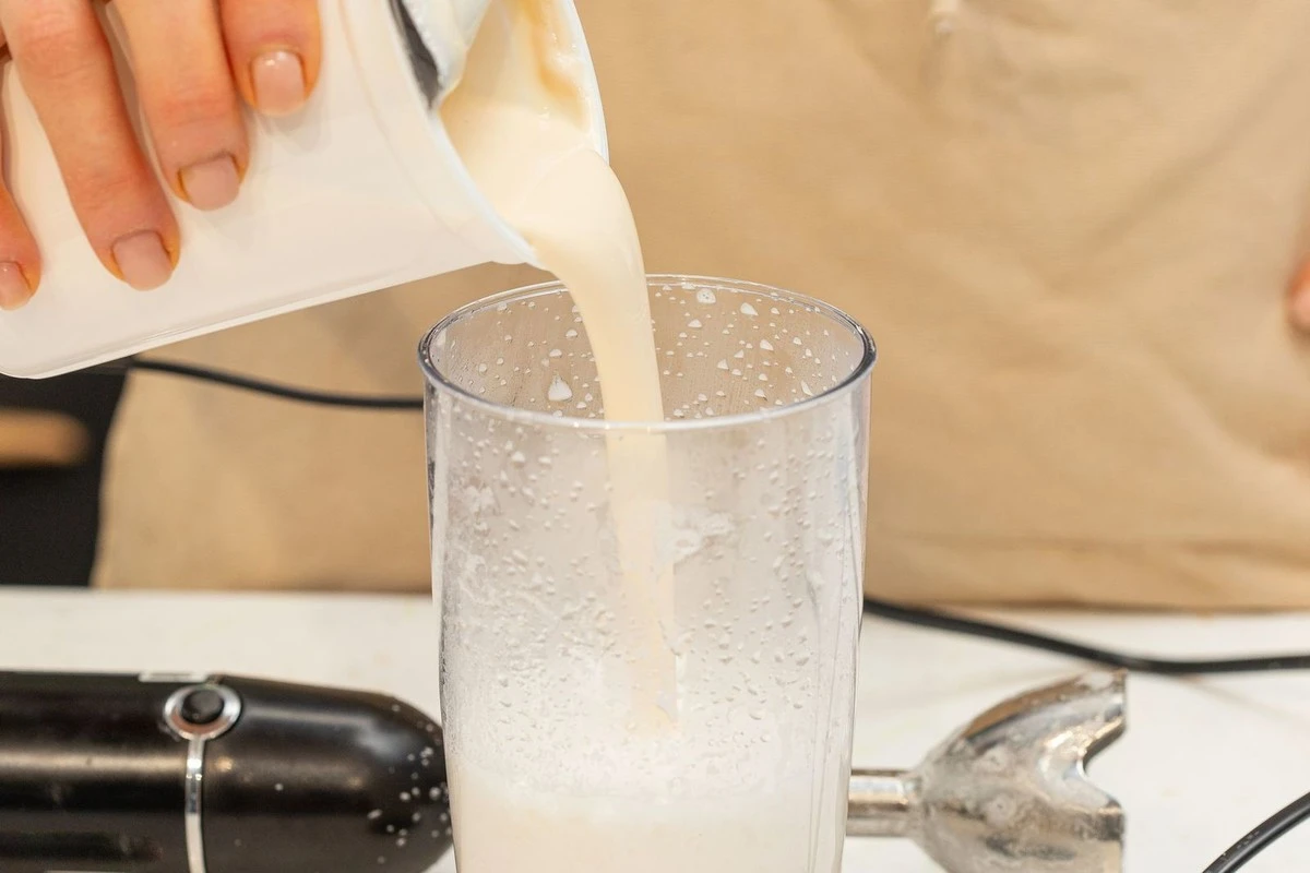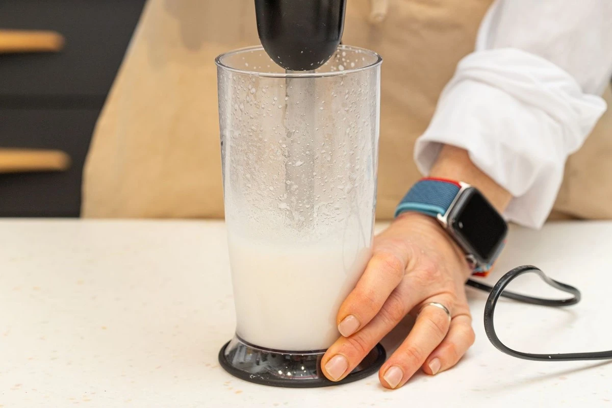 Вылейте в стакан всю ряженку и хорошо перемешайте блендером до однородности.