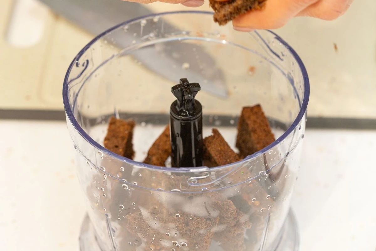 Высушенный хлеб поломайте на кусочки и положите в чашу блендера. Добавьте оливковое масло и измельчите в крошку.
