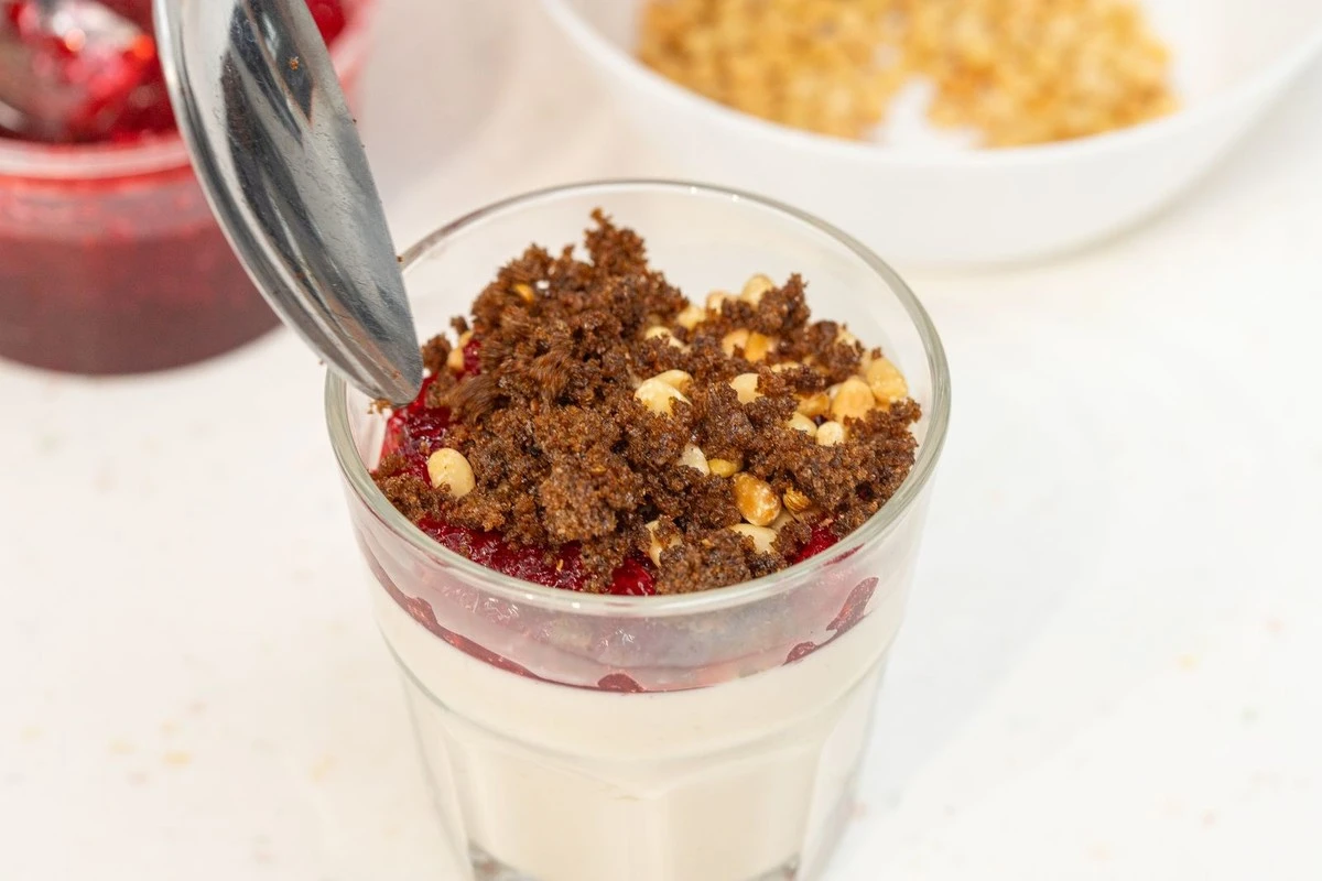 На застывшую ряженку в стаканах выложите немного клюквы с сахаром, присыпьте орешками и «землёй» из бородинского хлеба.