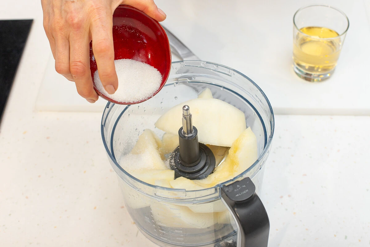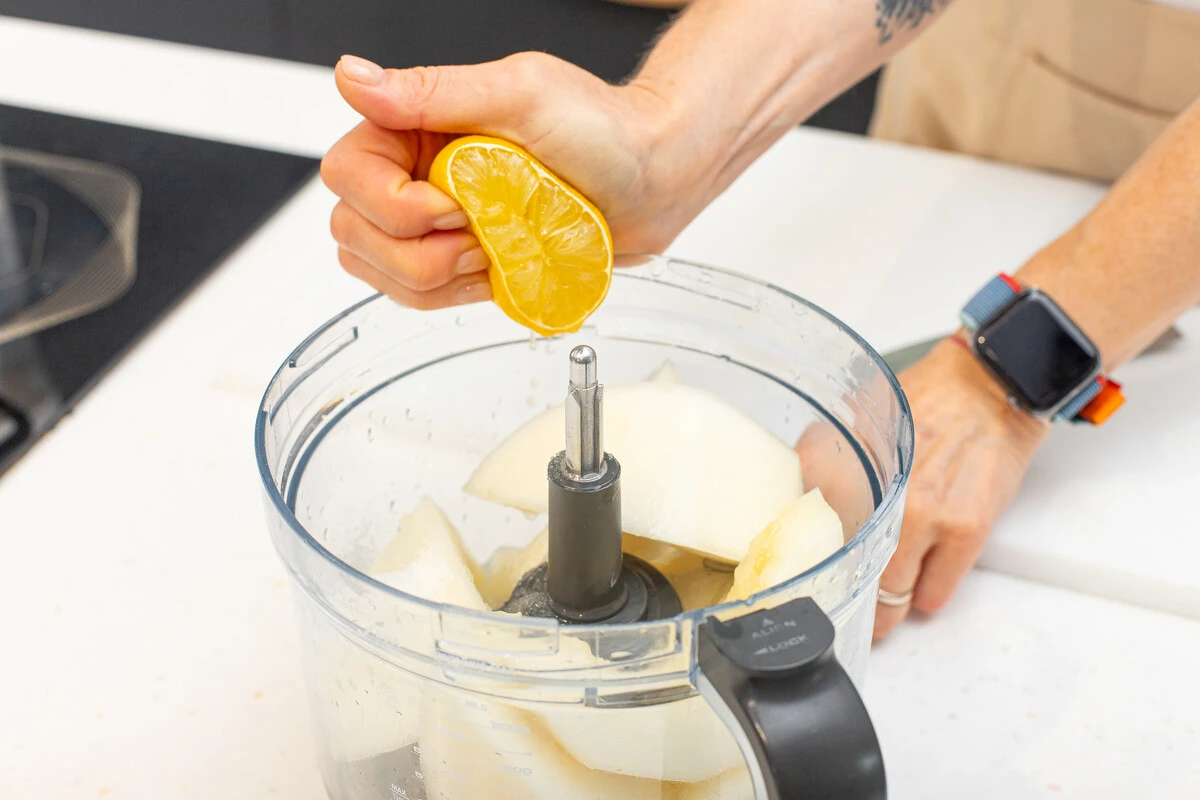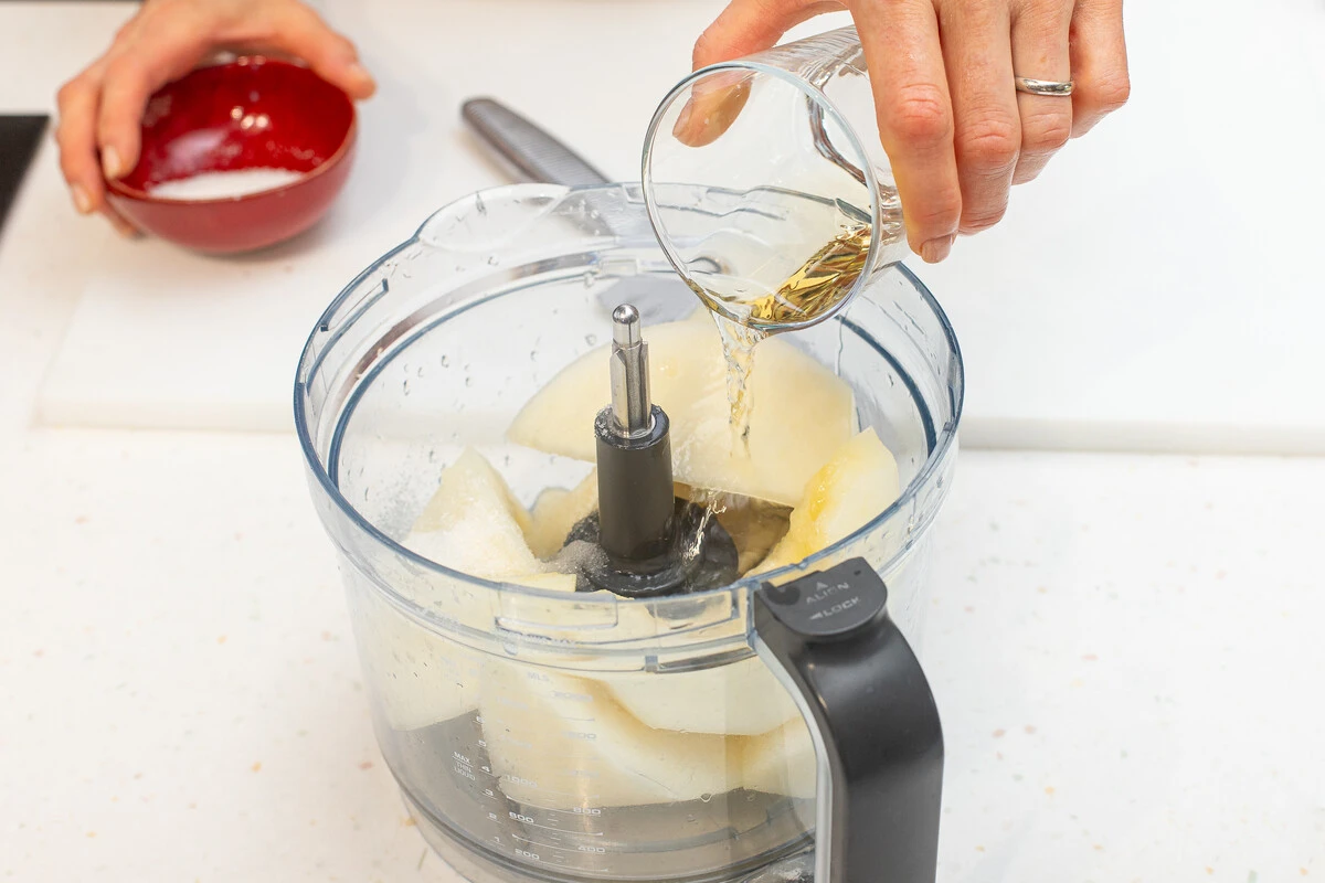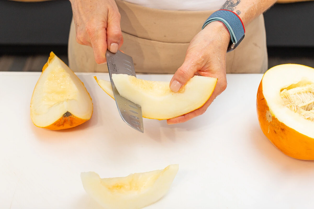 Почистите дыню, удалите семечки. Мякоть нарежьте крупно и положите в чашу кухонного комбайна или блендера.