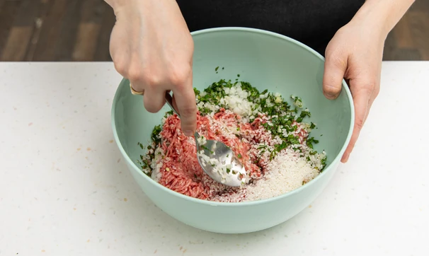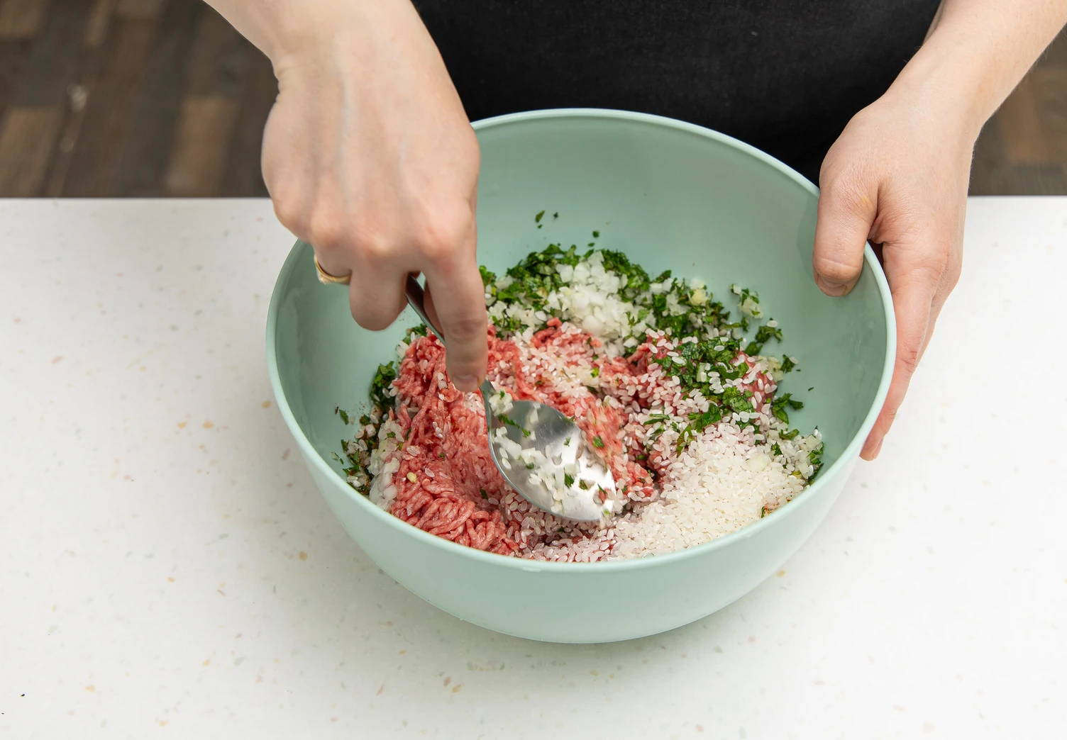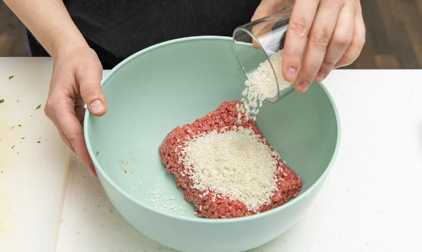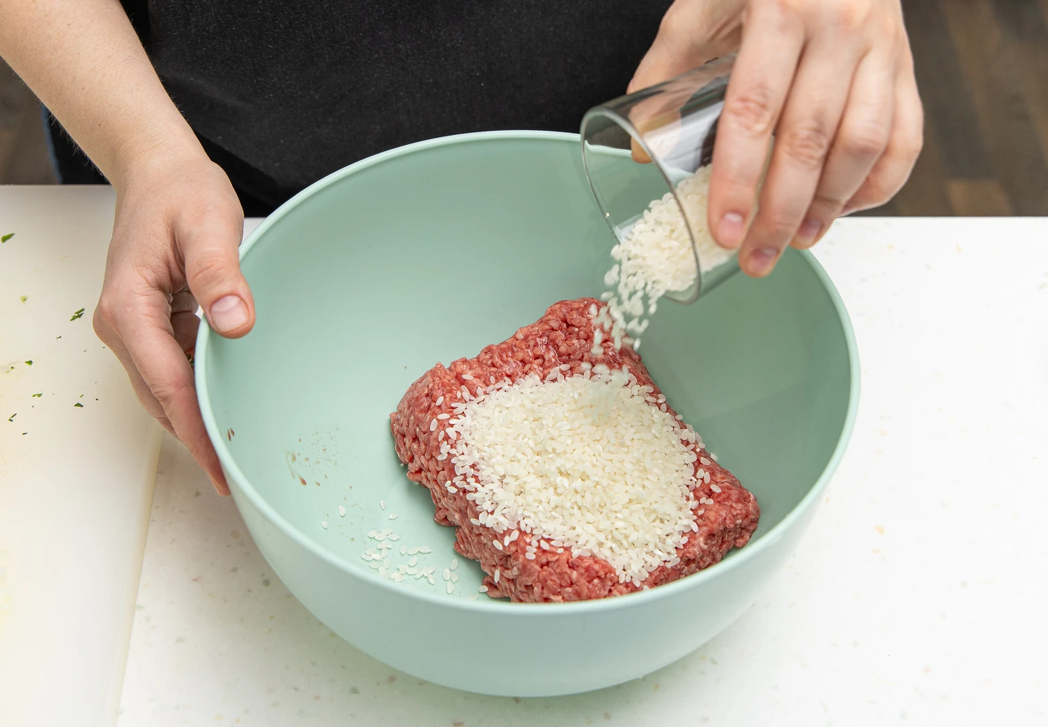 Переложите фарш и сырой рис в глубокую миску для вымешивания начинки.