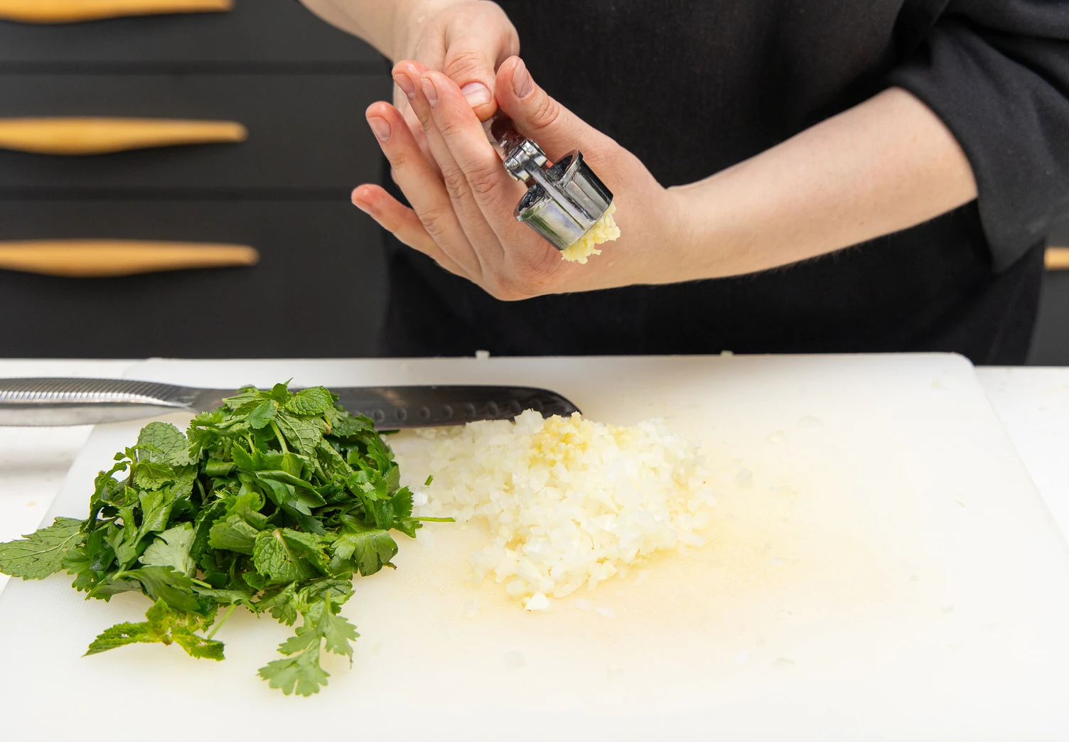 Лук, зелень и 2 зубчика чеснока мелко порубите.