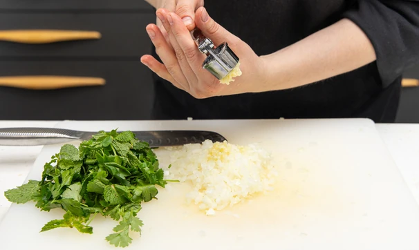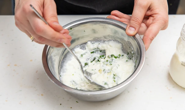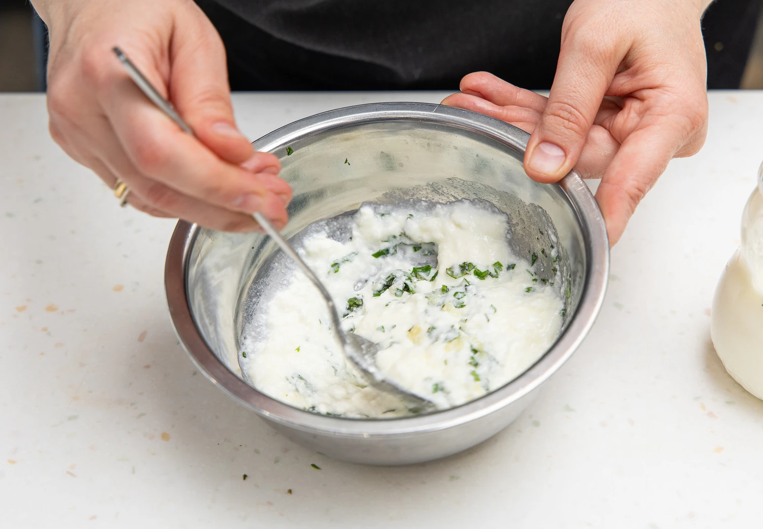 Приготовьте соус. Для этого смешайте мацони с оставшимся измельчённым чесноком и мелко рубленной зеленью.