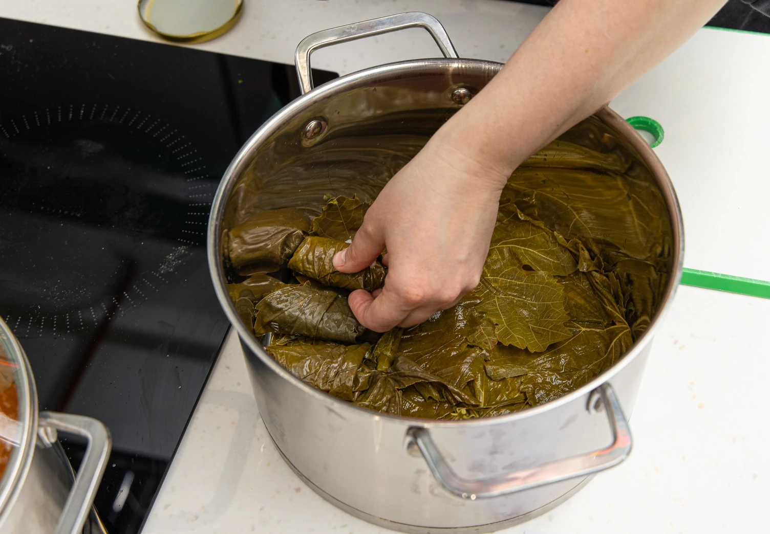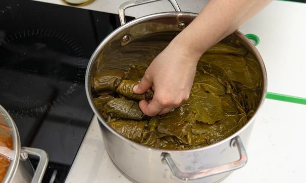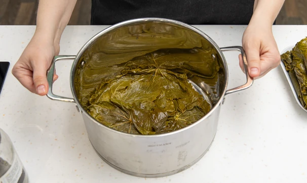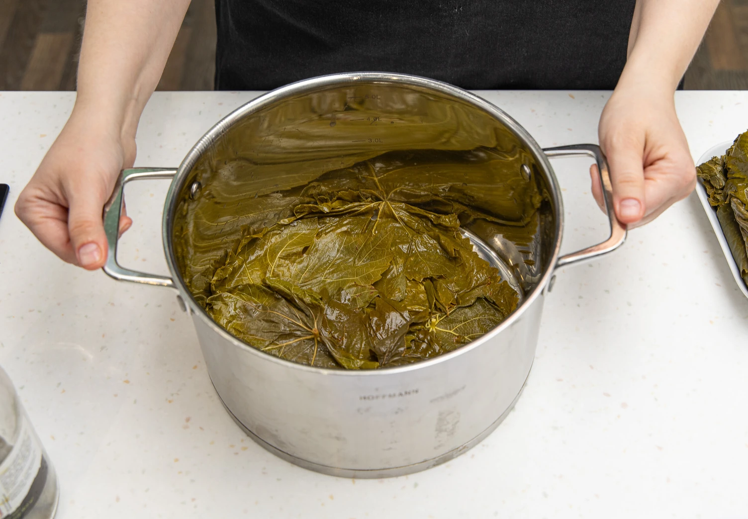 Для тушения долмы возьмите кастрюлю объёмом примерно 5 литров. Выстелите дно виноградными листьями, чтобы блюдо не пригорело.