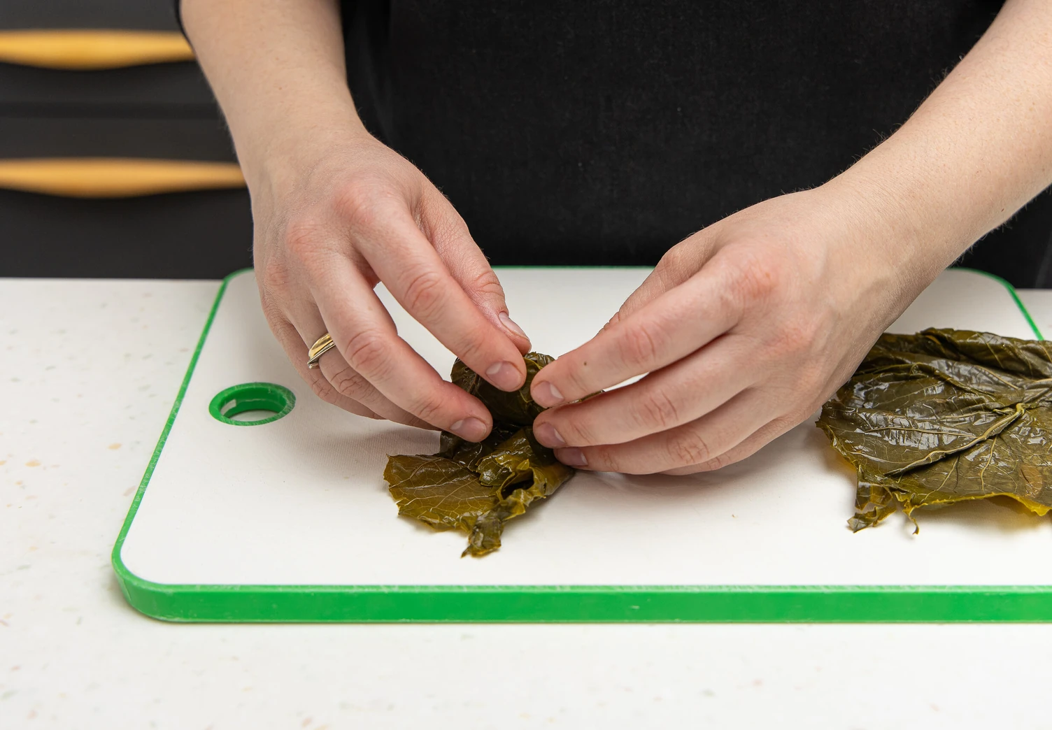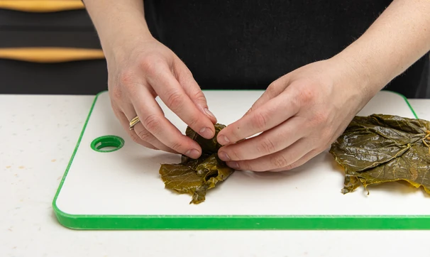 Заверните начинку в лист, подворачивая края. Не скручивайте слишком плотно, чтобы листики не лопнули, когда рис впитает воду и начинка увеличится в объёме. Гладкая часть листа должна остаться сверху.