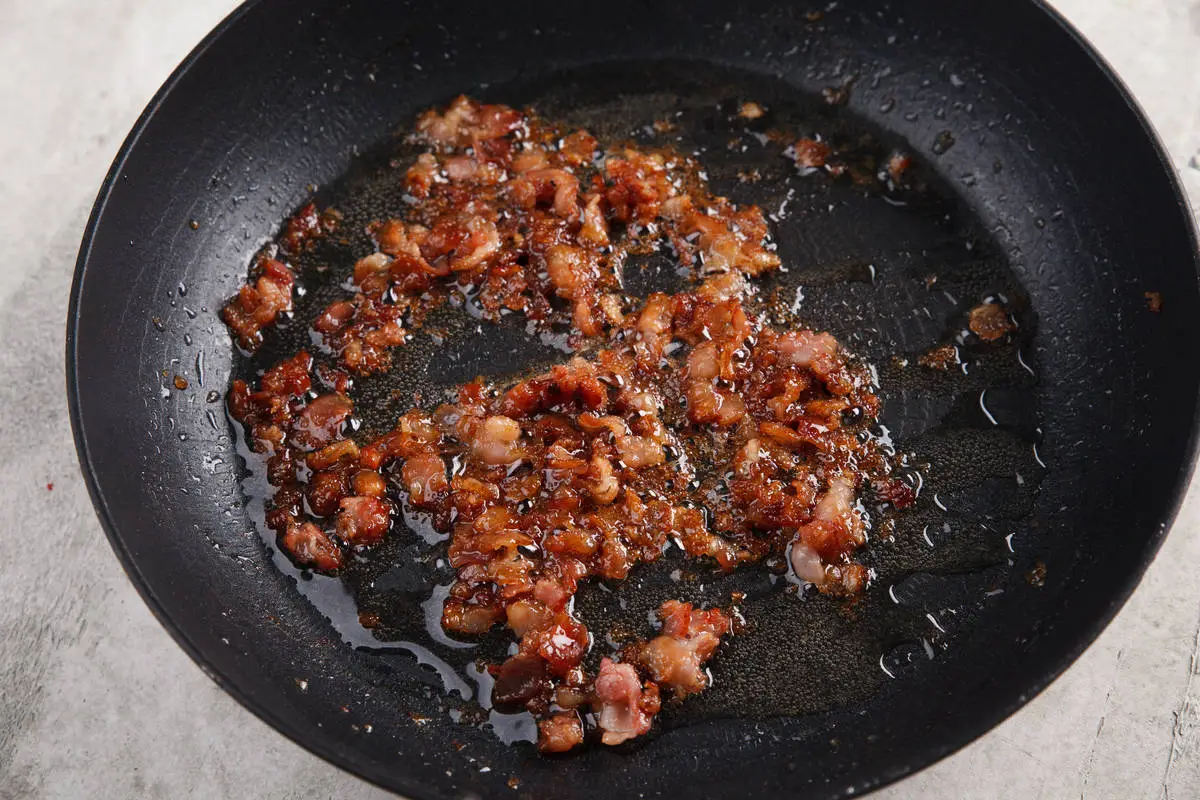 Бекон мелко нарежьте, выложите на сковороду и вытопите жир на среднем огне. Затем добавьте сахар, мешайте до растворения. Готовый бекон выложите на салфетку, чтобы стёк лишний жир, и сразу переложите на тарелку.