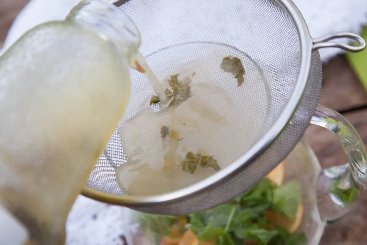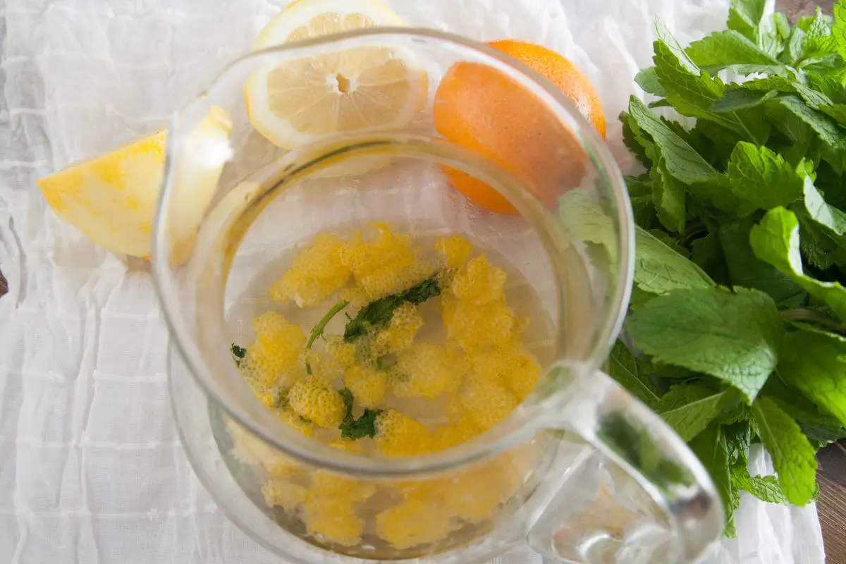 Сахар растворите в воде и доведите до кипения, добавив половину цедры и несколько веточек мяты. Дайте сиропу остыть до комнатной температуры и смешайте с лимонным соком и оставшейся цедрой, оставьте настаиваться 2-3 часа, а лучше ночь в холодильнике.