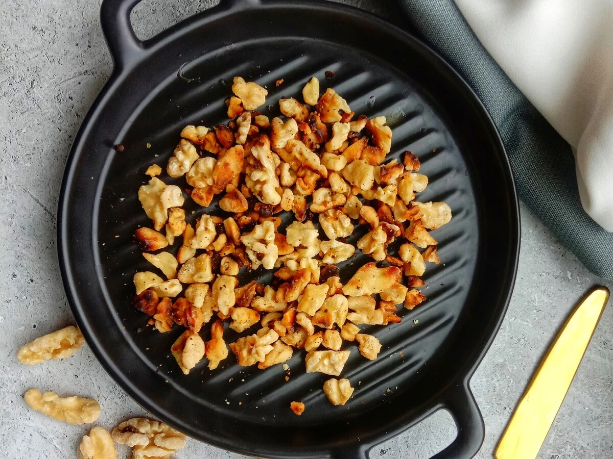 Орехи обжарьте на сухой сковороде 5 минут, периодически помешивая. Это придаст им хруст и усилит приятный ореховый аромат. Порубите ножом.