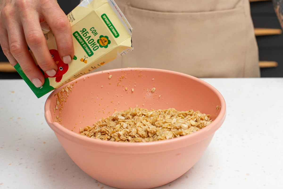 Высыпьте овсяные хлопья в миску. Добавьте кокосовое масло комнатной температуры и перемешайте. Добавьте мёд, влейте 100 мл яблочного сока и снова хорошо перемешайте, можно руками. Овсяные хлопья должны быть полностью покрыты маслом, мёдом и соком.