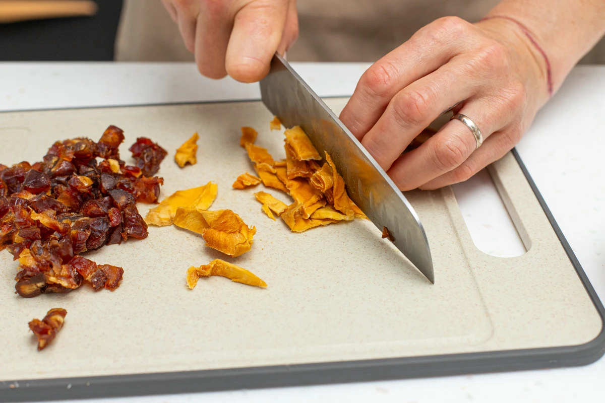 Финики разрежьте пополам и удалите косточки. Нарежьте финики кусочками среднего размера. Сушёное манго нарежьте так же.