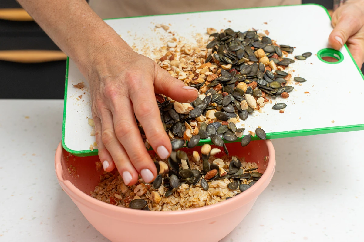 Добавьте рубленые орехи и тыквенные семечки к овсяным хлопьям, хорошо перемешайте.