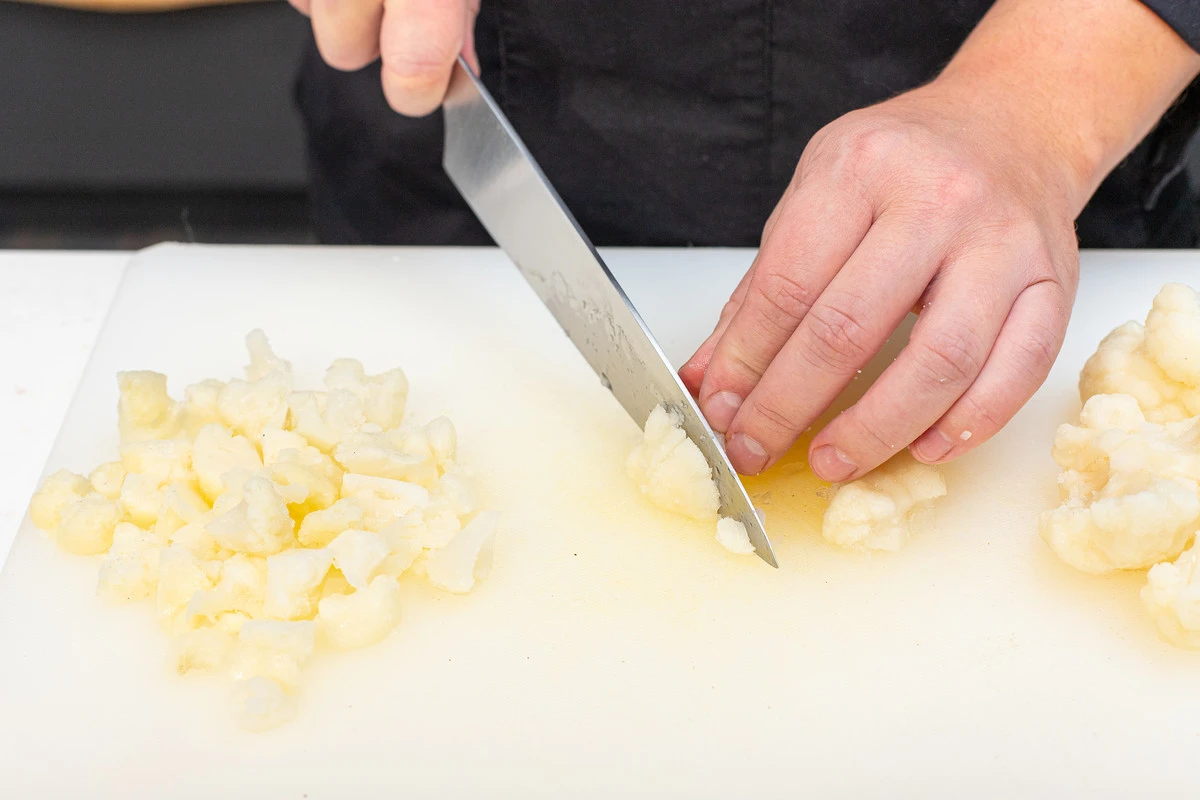 Цветную капусту нарежьте мелкими кубиками. Обжарьте на оливковом масле до золотистого цвета в течение примерно 10 минут, периодически помешивая.
