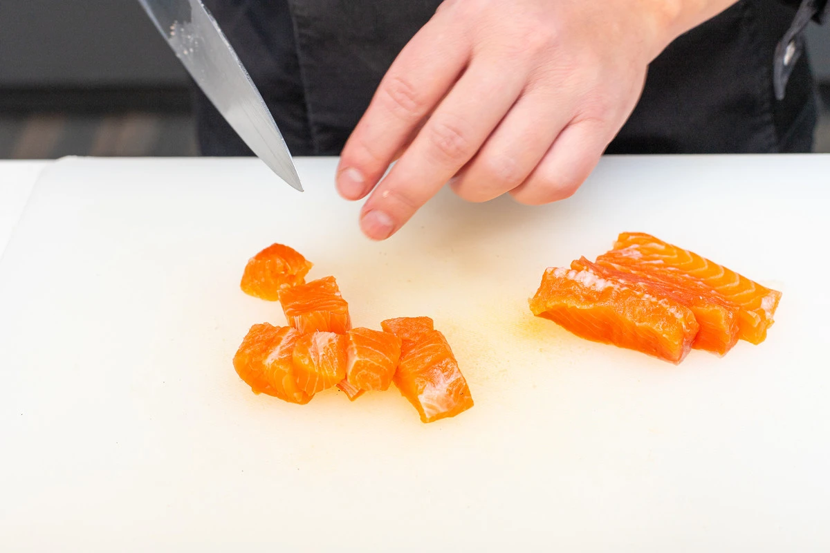 Филе форели снимите с кожи, удалите косточки, если есть. Нарежьте рыбу кубиками.