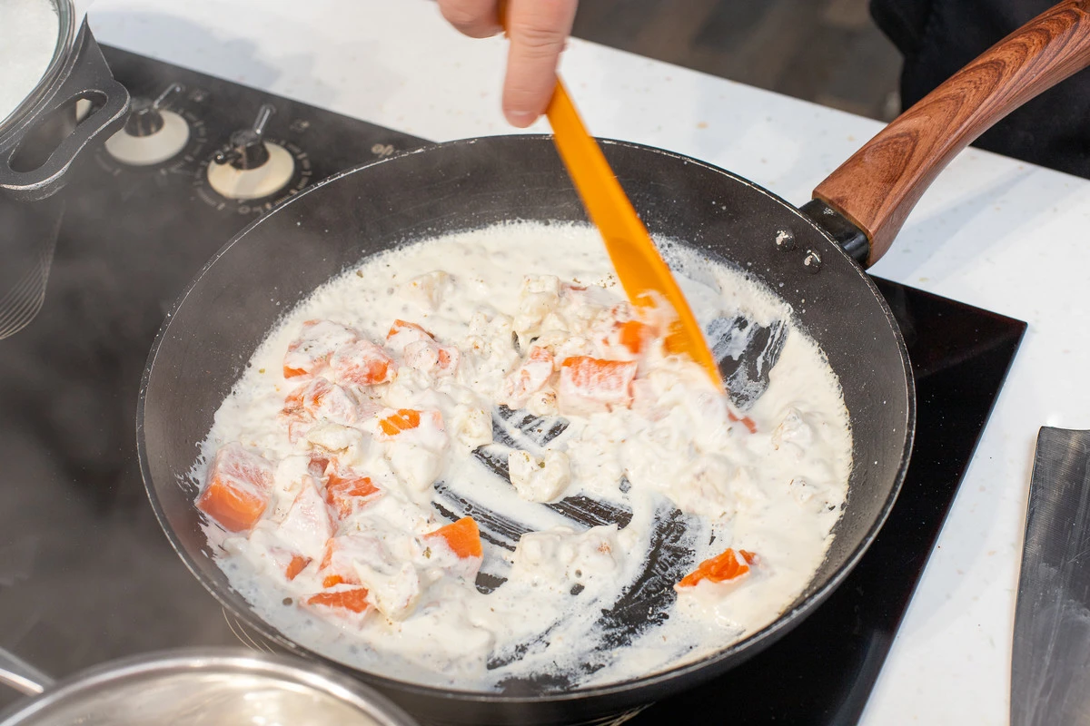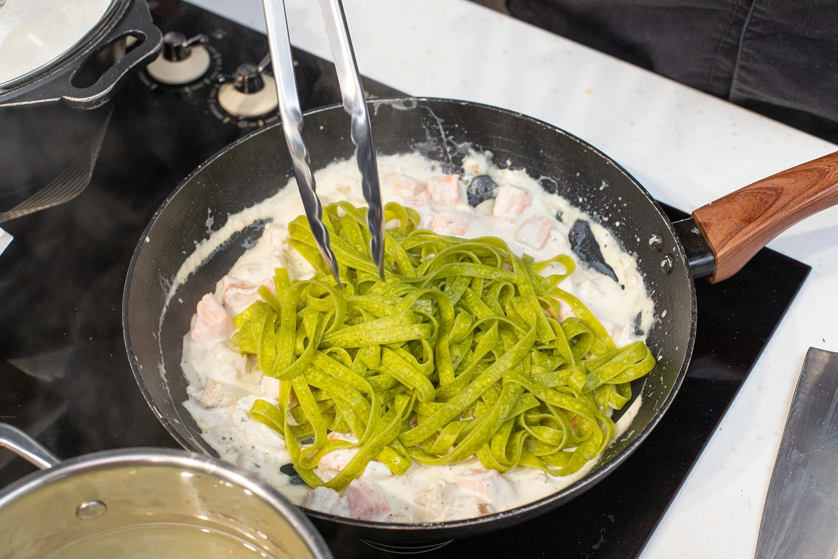 При использовании свежей пасты блюдо, как правило, получается более нежным на вкус. Мы добавили к фетучини форель, цветную капусту, сливки, пармезан и специи — получилось очень вкусно! Попробуйте и вы.