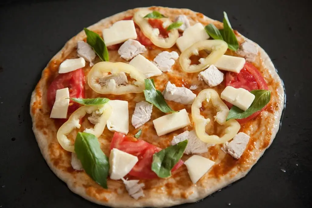 Для пиццы с курицей и овощами смажьте тесто томатным соусом, выложите порезанные колечками помидоры, болгарский перец, кусочки отварной грудки и сулугуни. Духовку разогрейте до максимальной температуры — около 230С и запекайте пиццу на смазанном маслом противне — 10-15минут.