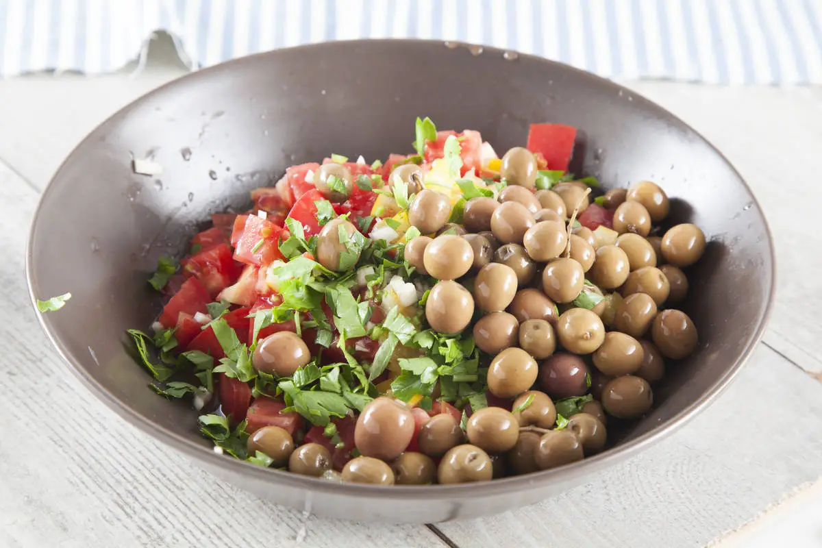 Помидоры порежьте кубиками, смешайте с оливками. Оливки можно использовать без косточек, такое блюдо будет удобнее есть, но зато мелкие оливки с косточками гораздо более ароматные.