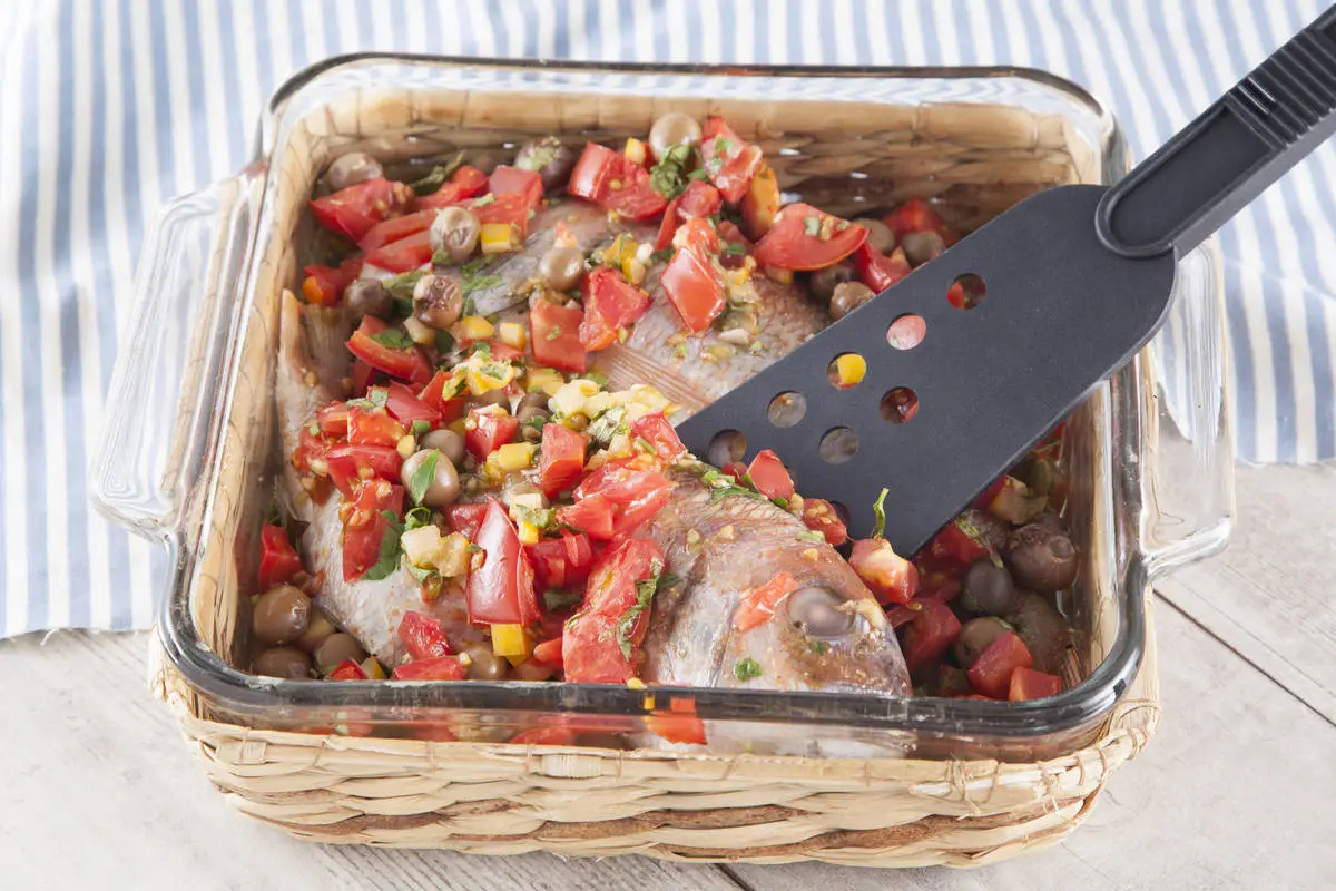 Выложите получившуюся смесь на рыбу, полейте оливковым маслом и запекайте в духовке при 180 градусах 25-30 минут до готовности. Подавайте со свежим хлебом и легким белым вином.