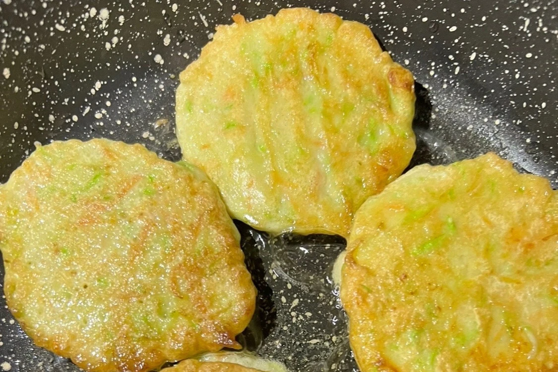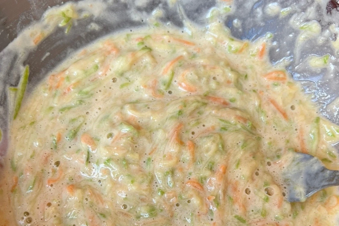 Для начала промойте кабачок, морковь, картофель. Почистите овощи (кабачок по желанию), измельчите на крупной или средней тёрке. Хорошенько их отожмите и слейте выделившуюся жидкость.