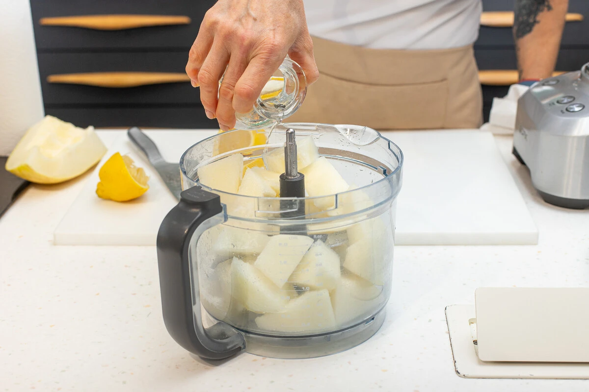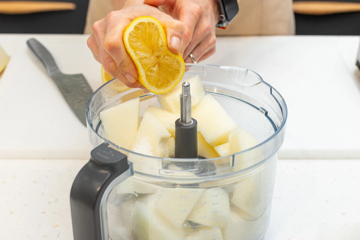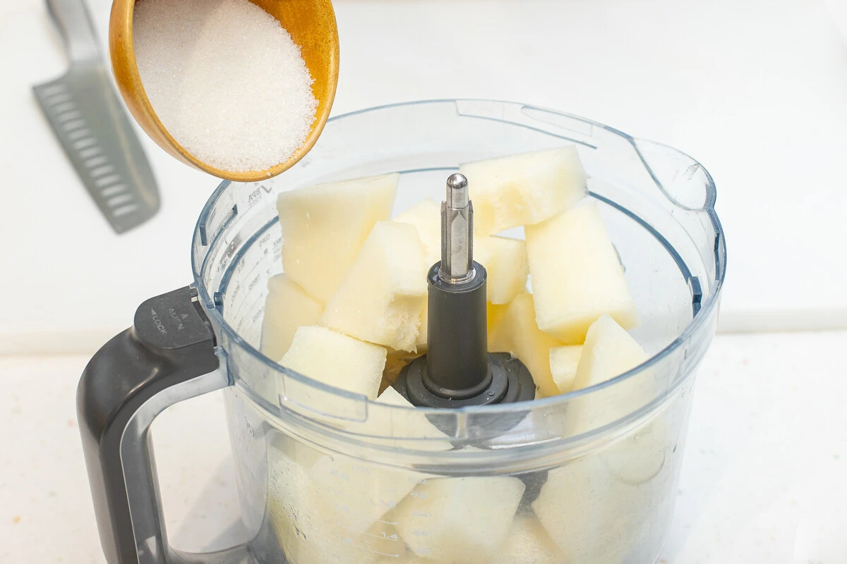 Сложите дыню в чашу кухонного комбайна или блендера. Добавьте сахар.