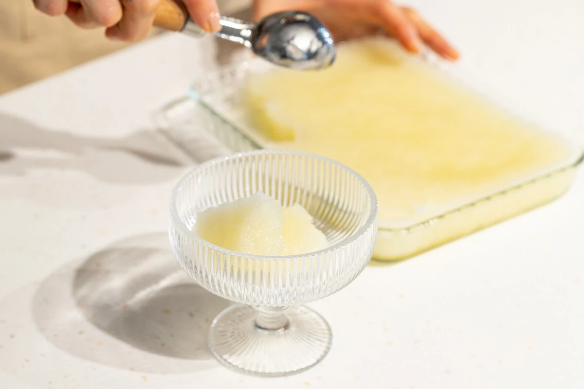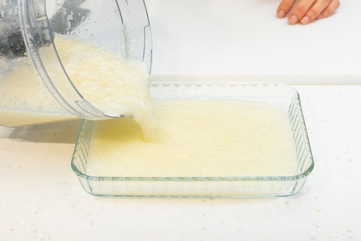 Перелейте получившуюся смесь в контейнер и уберите в морозильную камеру на 1,5 часа. Через 1,5 часа достаньте контейнер, тщательно перемешайте сорбет и снова уберите в морозилку. Через 1 час снова достаньте, перемешайте и оставьте десерт в морозильной камере.
