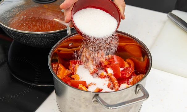 Выложите их в кастрюлю, добавьте сахар, соль и воду. Если хотите более пикантный вариант, возьмите больше острого перца.