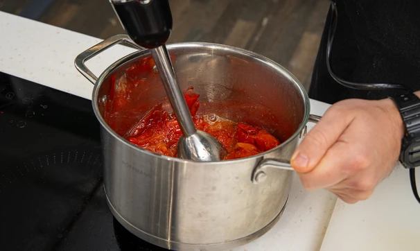 Снимите кастрюлю с огня и пробейте содержимое погружным блендером до однородной массы.