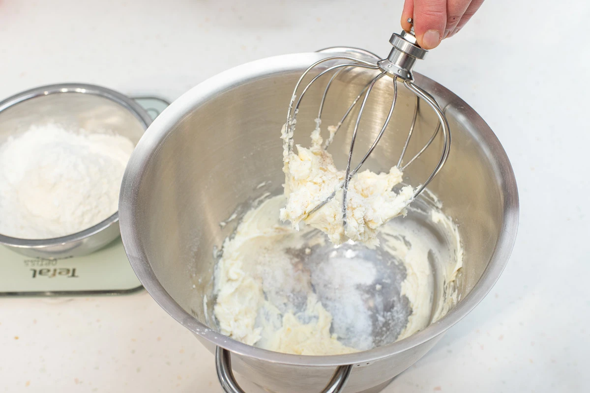 Масло комнатной температуры взбейте добела с сахарной пудрой, затем добавьте желтки и снова взбейте.