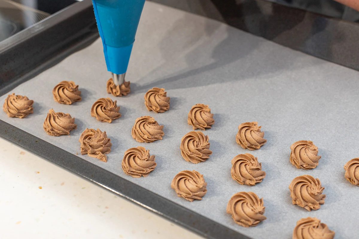 Выложите тесто в кондитерский мешок с насадкой «закрытая звезда» и отсадите на противень, застеленный пергаментом, печеньки по 8-10 г. Выпекайте в предварительно разогретой до 170°C духовке в течение 14-15 минут.