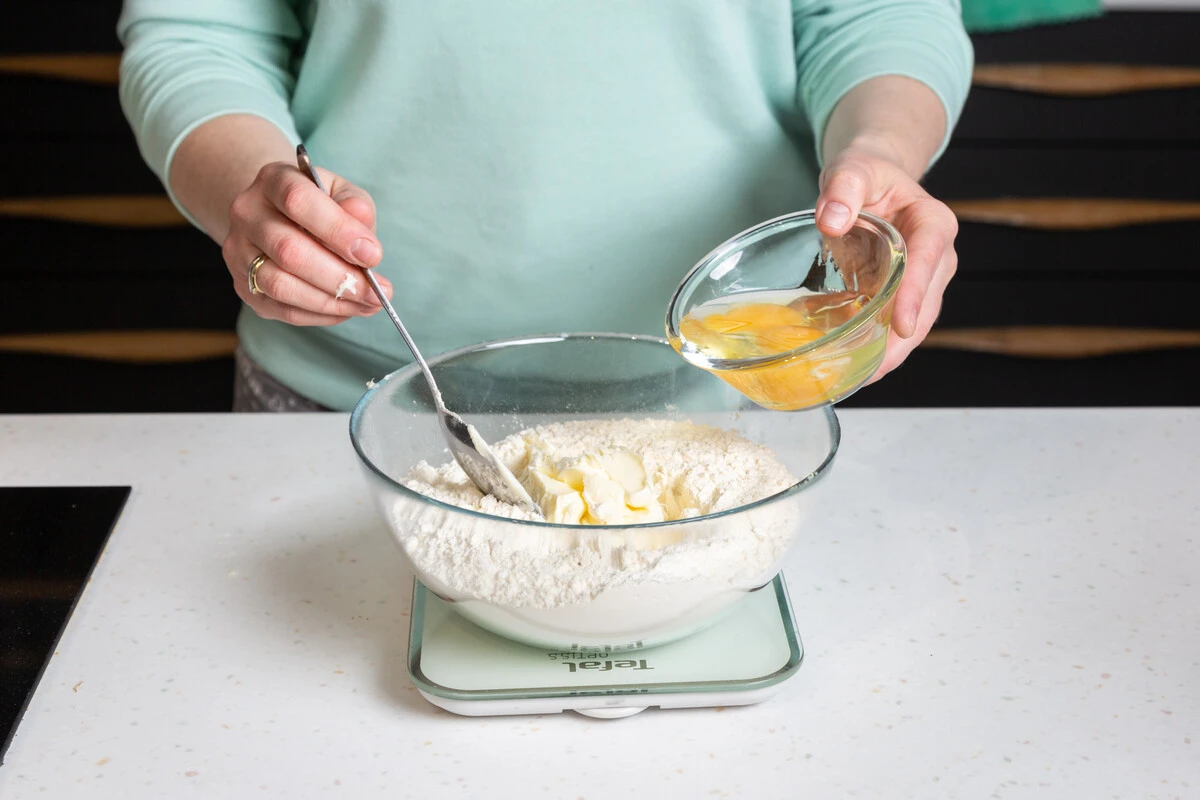 В большой миске смешайте муку и соль. Добавьте сливочное масло, нарезанное небольшими кубиками, и яйца. Начните замешивать тесто, постепенно вливая тёплую воду, пока оно не станет гладким и эластичным. Скатайте в шар, накройте полотенцем или пищевой плёнкой и оставьте отдыхать на 1 час.