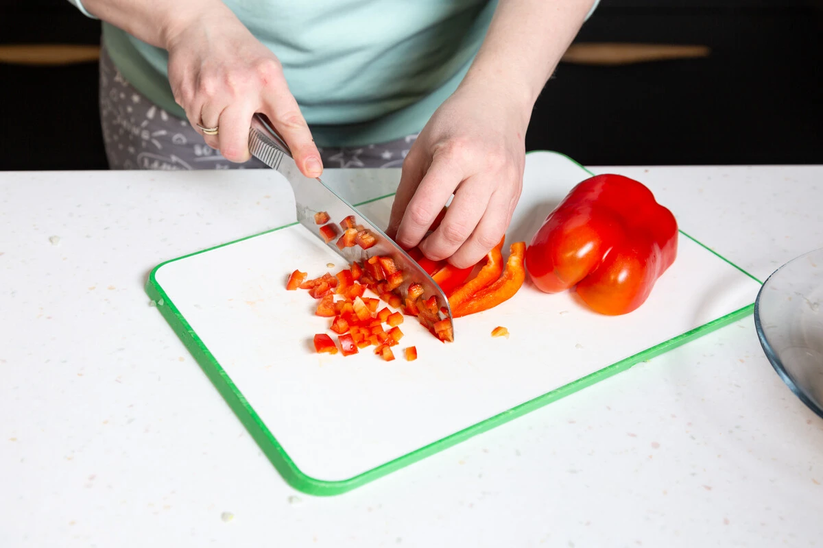 В это время приготовьте начинку. Мелко порубите лук и чеснок. Очищенный от семян болгарский перец нарежьте мелкими кубиками.
