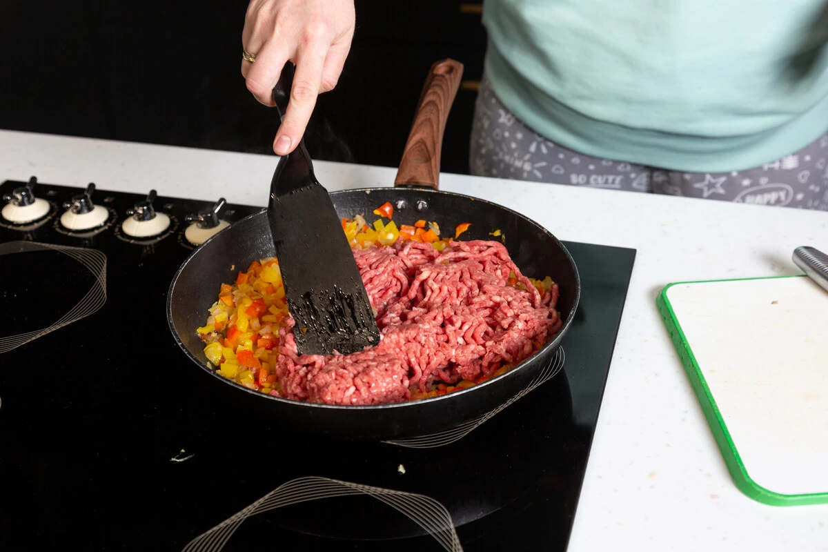 В глубокой сковороде обжарьте овощи до мягкости. Добавьте фарш, посолите и поперчите. Жарьте до готовности мяса. Затем дайте начинке остыть до комнатной температуры.