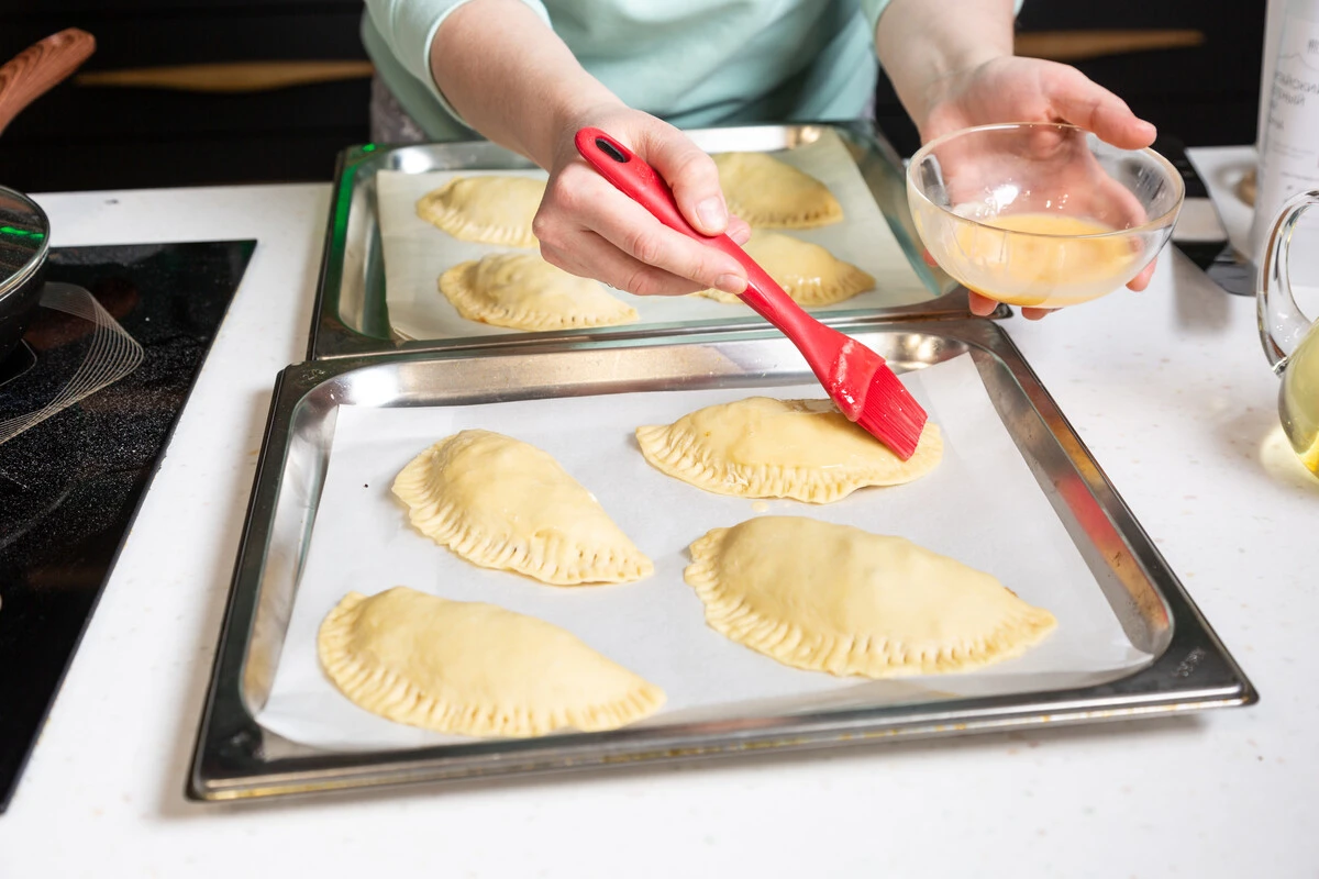 Пройдитесь вилкой по контуру каждого пирожка для дополнительной фиксации и смажьте заготовки слегка взбитым яйцом.