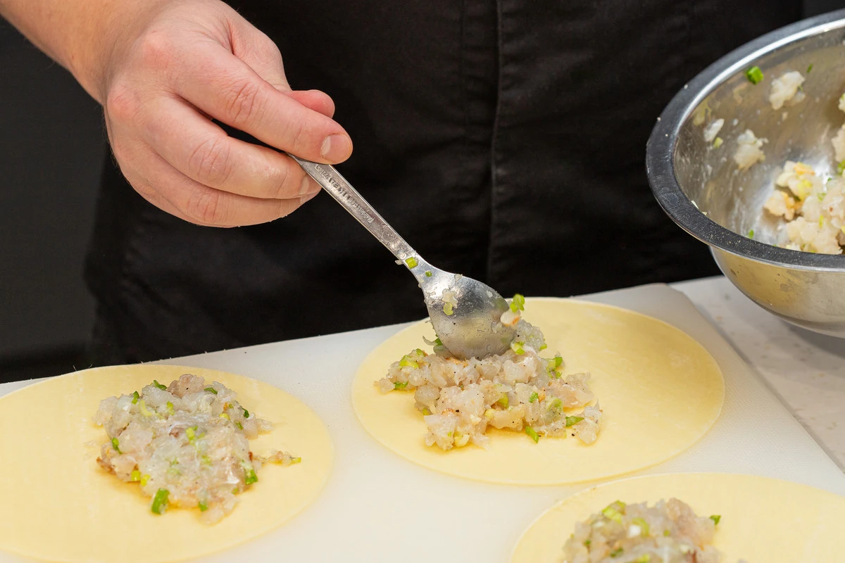 Выложите по столовой ложке фарша в каждую половинку теста.