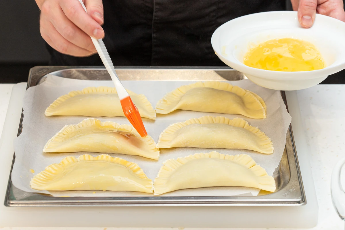 Яйца слегка взбейте с водой и смажьте полученной смесью эмпанадас. Дайте пирожкам постоять 10 минут перед выпечкой.