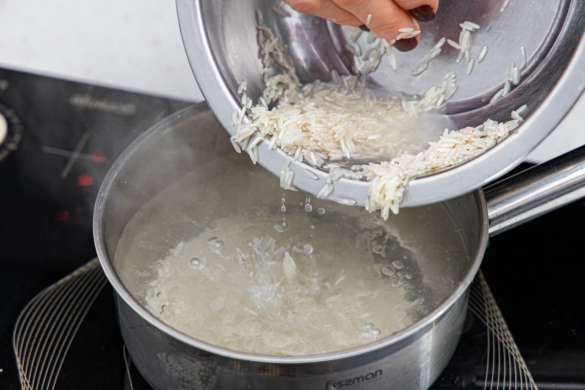 Промойте рис и поставьте вариться в подсоленной воде.
