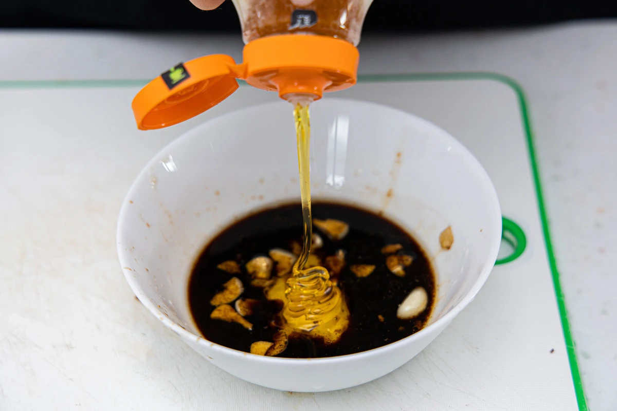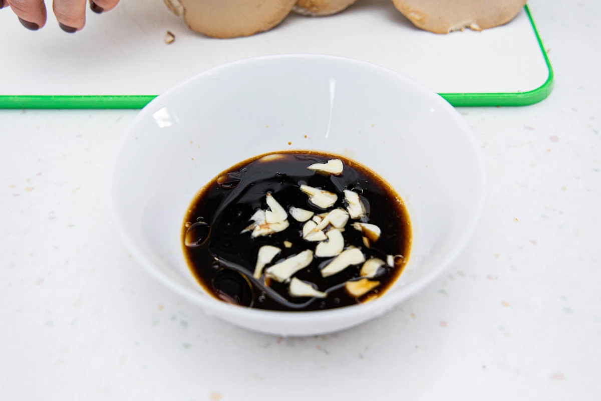 Смешайте соевый соус с кунжутным маслом и соком лайма. Очистите чеснок, измельчите и добавьте к жидким компонентам — у вас получится маринад.