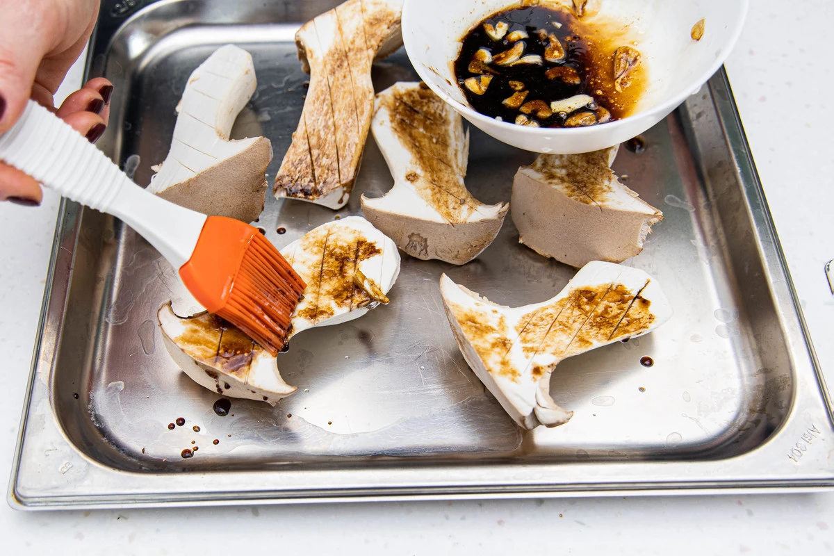 Грибы разрежьте вдоль пополам или тонкими слайсами, сделайте косые надрезы острым ножом. Оставьте в половине маринада на 10 минут.