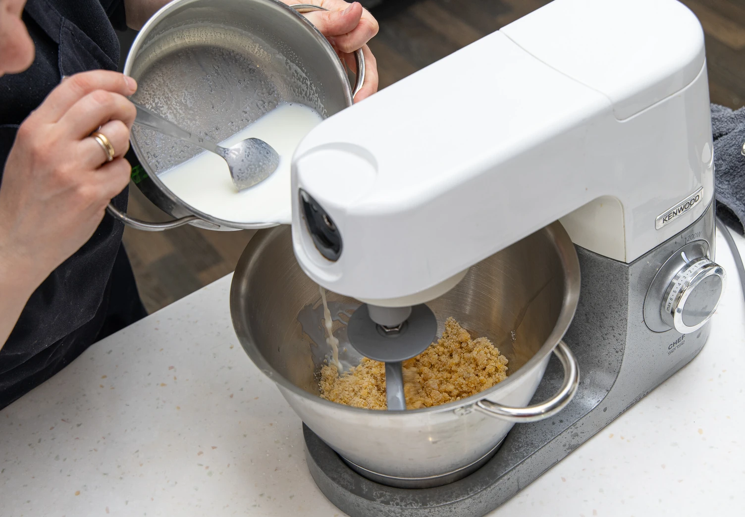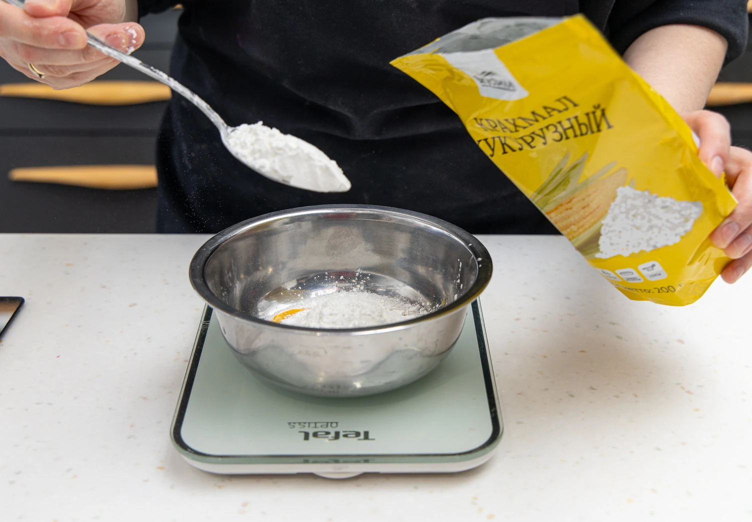 Нагрейте молоко, не доводя до кипения. Постоянно помешивая, тонкой струйкой влейте горячее молоко в яичную смесь.