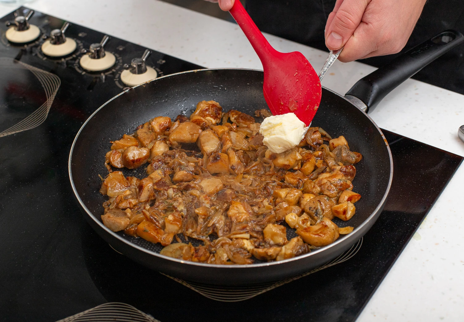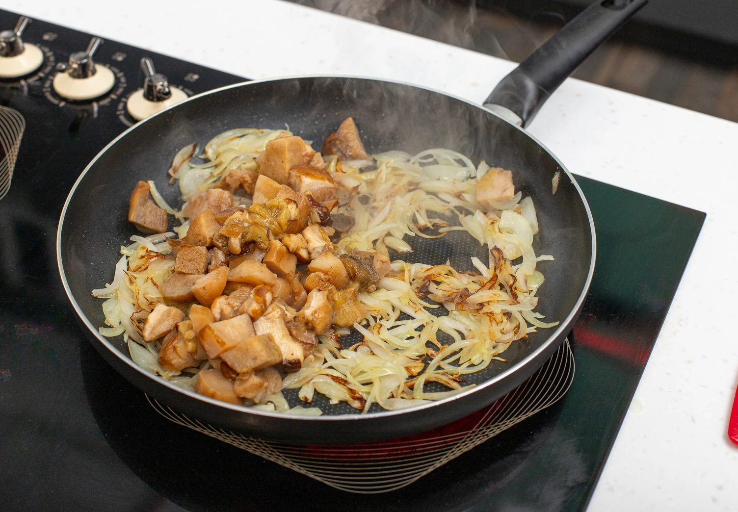 Репчатый лук нарежьте полукольцами и обжарьте на оливковом масле до золотистого цвета. Влейте в сковороду около 100 мл воды и готовьте ещё 5–7 минут, чтобы лук стал мягче. Затем добавьте размороженные белые грибы и жарьте до тех пор, пока не выпарится вся влага.