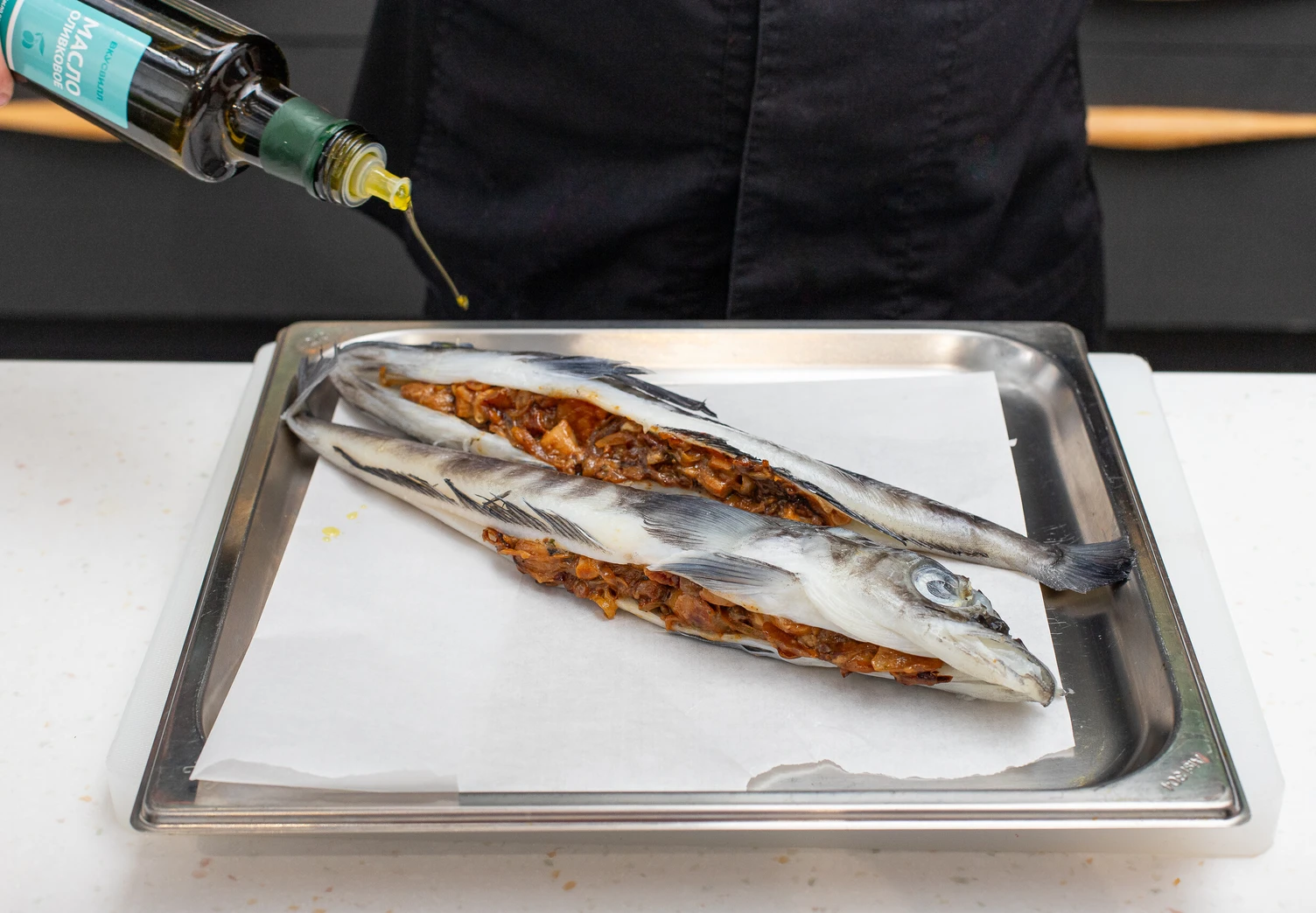 Потрошёную рыбу заполните начинкой, смажьте оливковым маслом и посолите.