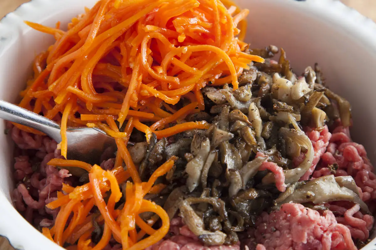 Смешайте с сырым фаршем, добавьте корейскую морковь, пропущенные через пресс чеснок и имбирь, часть кинзы немного перца для остроты, часть порубленной кинзы и соевый соус, тщательно все перемешайте.