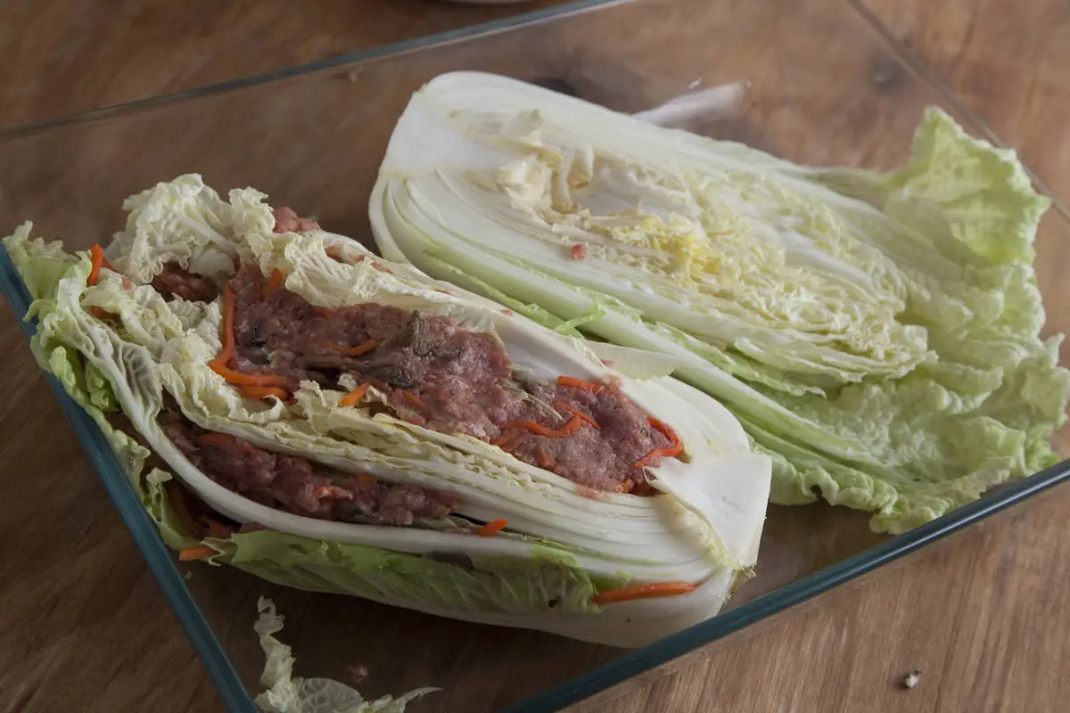 Пекинскую капусту разрежьте пополам вдоль, выложите в форму для запекания.
